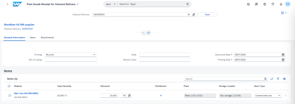Berikut terlihat bagaimana tampilan posting penerimaan barang untuk memastikan barang-barang tersebut sesuai dengan jumlah dan spesifikasi pesanan pembelian (PO).